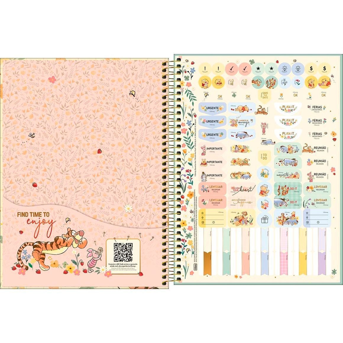 Use este modelo, com capa dura com a parte interna decorada, bolsa de papel para guardar trabalhos, adesivos funcionais, folhas pautadas e espiral colorido, para anotar as aulas, fazer resumos, listar tarefas e organizar as ideias de forma prática e eficiente.